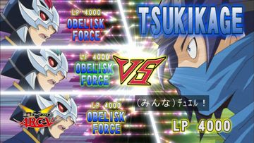 遊戲王ARC-V #88 「強襲!オベリスク・フォース (強襲!Obelisk Force)」。今回提到為了保護賽妮娜與零羅,月影決定尋找地下同伴的協助,然而途中他卻遇上了融合精銳部隊,四面楚歌……同時,遊吾終於遇上了遊里,遊矢則為了尋找賽妮娜而奔走,他們到底會遇上什麼……?