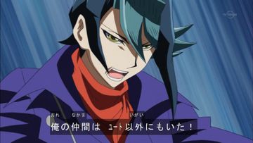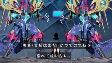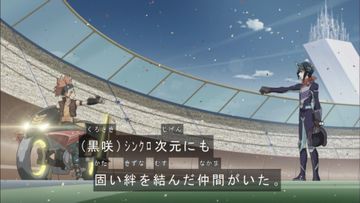 在途中黑咲用動作卡,然後道出自己走過各次元的事情。最初自己的同伴只有遊斗,然而到了同步次元,有騎兵同伴,也有過共同作戰的克羅,到了現在已不是孤身一人。